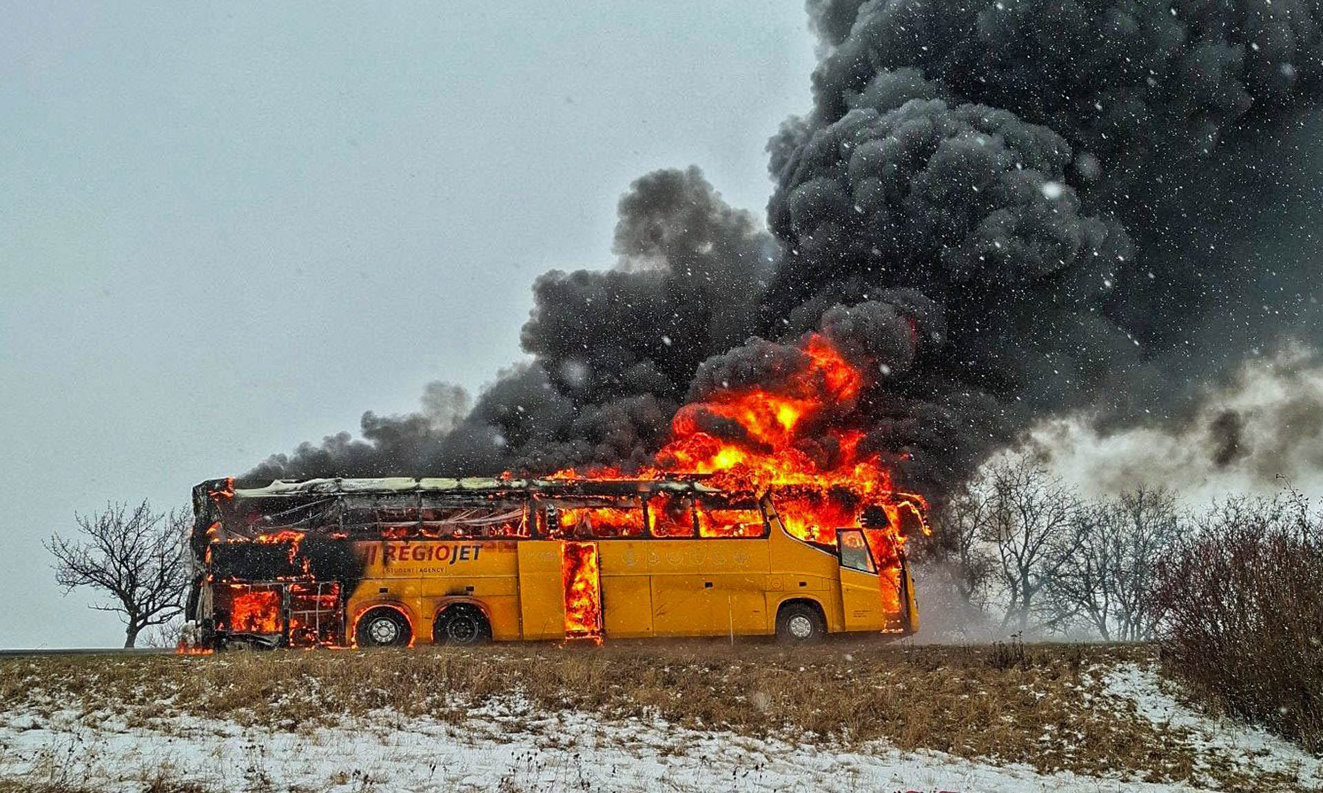 Na dálnici D46 ve směru z Prostějova na Vyškov na 17. kilometru hořel dálkový autobus. Dálnice je po dobu zásahu dočasně uzavřena, na místě zasahují hasiči i policisté.