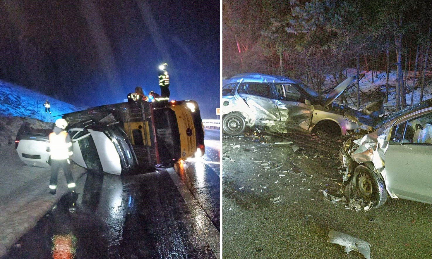 Potíže jsou také v jižních Čechách, kde hasiči během krátké doby zasahovali u pěti dopravních nehod. První z nich se stala u Horního Dvořiště, kde bourala dodávka. Následovala kolem páté hodiny ráno nehoda dvou kamionů na 125. kilometru dálnice D3 u Úsilného.
