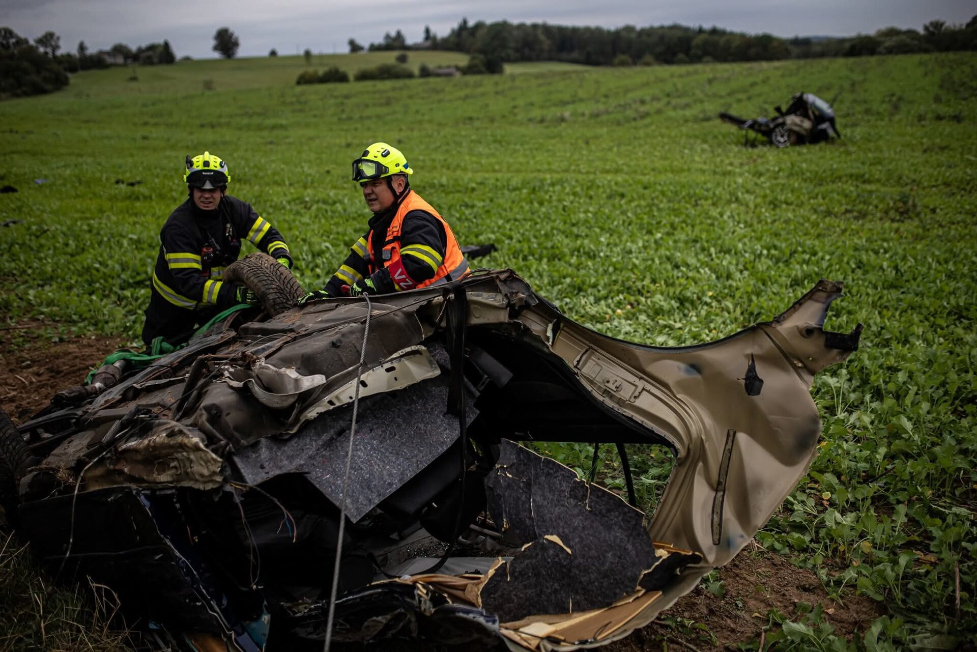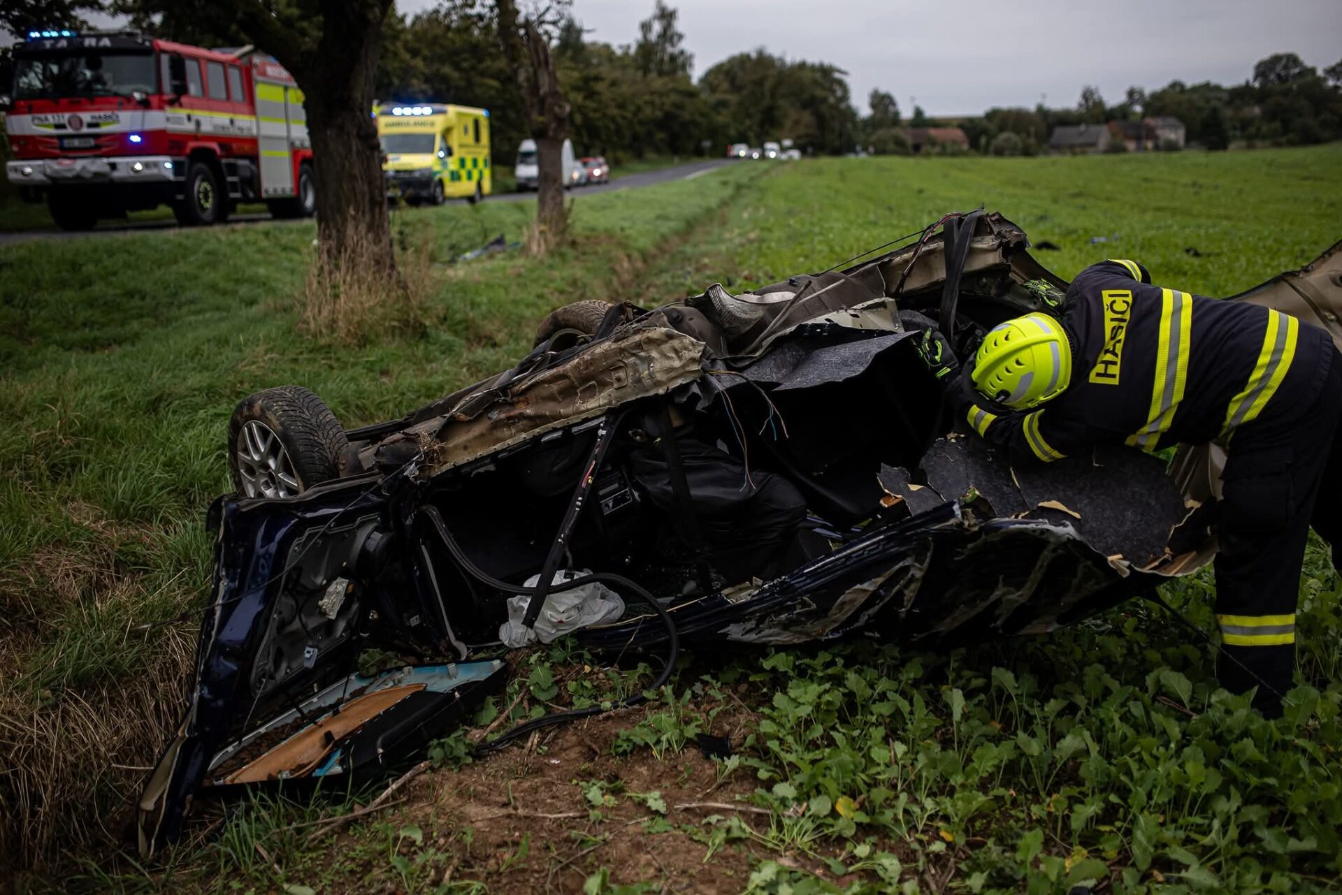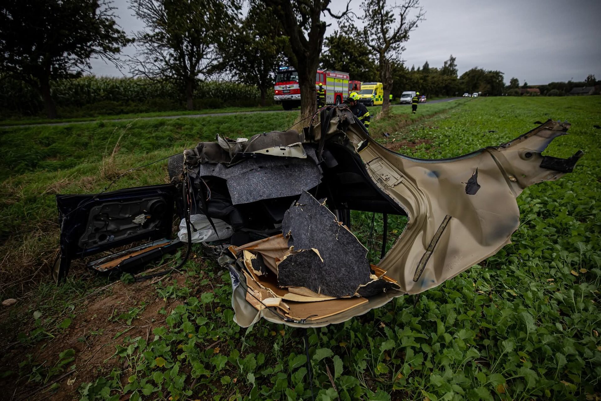 Mezi obcemi Sebuč a Chvalkovice na Náchodsku se dnes stala hrozivě vypadající nehoda osobního auta, které se podle zasahujících hasičů doslova rozpáralo o ovocný strom. Dvě půlky auta byly po nárazu rozházené po poli.