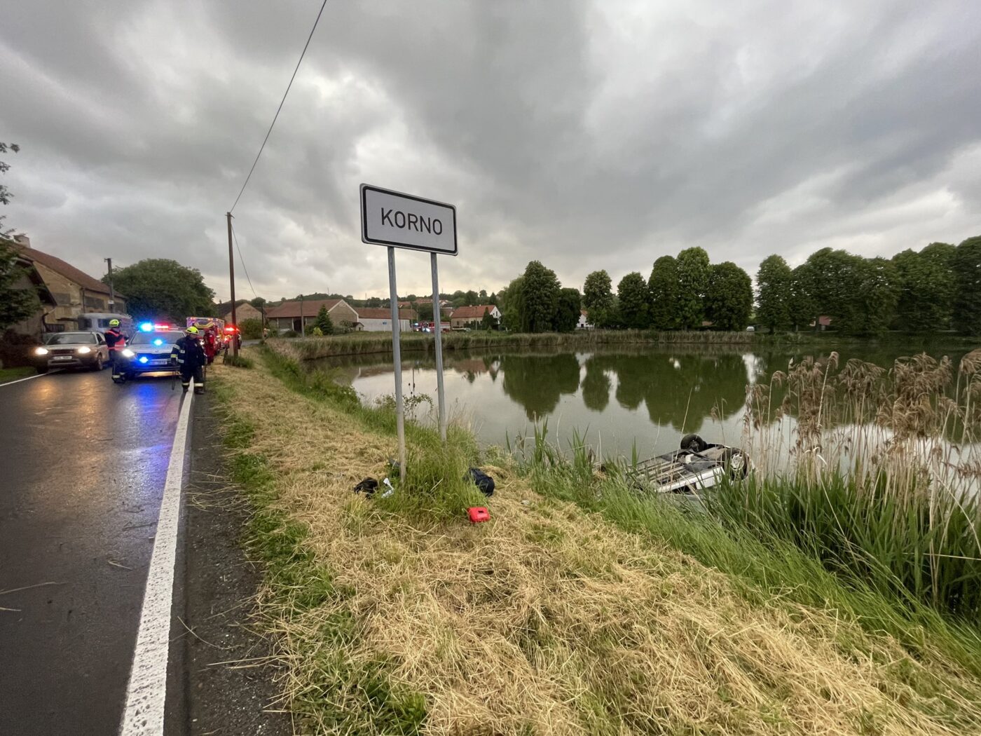 Ve čtvrtek v podvečer sjelo v obci Korno na Berounsku osobní vozidlo se dvěma mladíky do místního rybníka a převrátilo se na střechu. Auto se jim podařilo opustit ještě před příjezdem záchranářů.