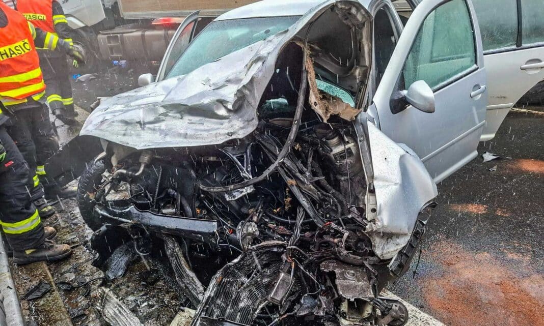Následovala poměrně drtivá srážka, řidič osobního auta utrpěl zranění a musel být transportován do nemocnice.