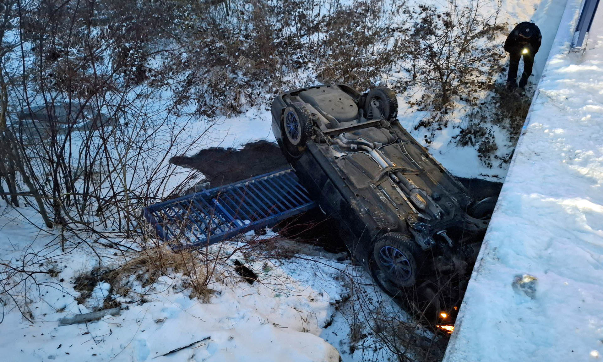 V souvislosti s počasím řeší hasiči a policisté v sobotu v podvečer nehodu v Újezdu na Olomoucku, kde řidič Octavie dostal s vozem na zasněžené silnici smyk, narazil do zábradlí, které prorazil a zřítil se do potoka. Auto se přitom převrátilo na střechu.