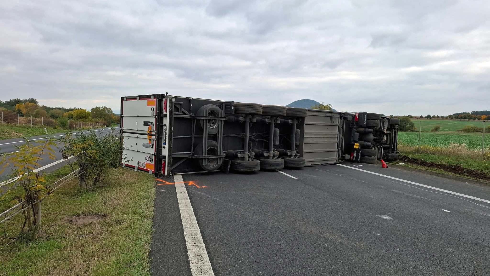 Zřejmě celou neděli bude uzavřena dálnice D8 ve směru na Ústí nad Labem. Na 22. kilometru za Prahou u Ledčic se totiž převrátil kamion na bok a zůstal ležet napříč silnicí.