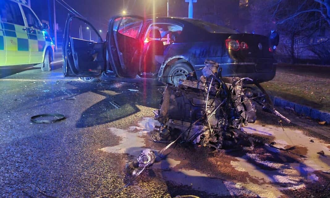 Vážná nehoda se stala v sobotu brzy ráno v Pardubicích. Havaroval tam osobní vůz, v němž jeli dva dospělí a dítě. Při havárii z vozu vyletěl motor.