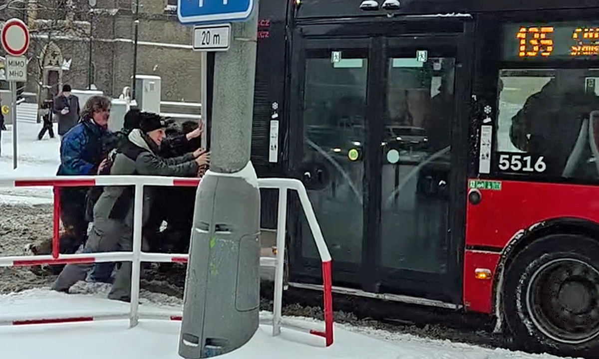 Autobus linky 135 nemohl vyjet slabé stoupání od náměstí Míru v centru Prahy. Sami cestující tak kloubovému kolosu pomohli pěkně ručně. Sám řidič je povzbuzoval přes reproduktor. „Pojďte, pojďte, vypadá to nadějně, ano a už jsme ze silnice venku. Krásný úspěch, děkuju vám a teď už zůstanu viset tady,“ povzbuzoval řidič ve stylu televizního komentování sportovních zápasů.